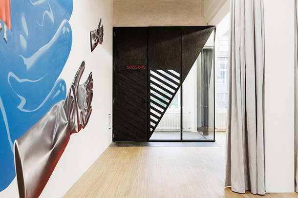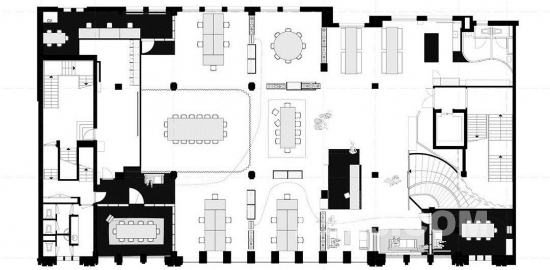 所以在設計方面,為了打造一個高表現力的空間、尋找低價的建筑方法,設計公司運用了定向刨花板和數控機床設備,通過21世紀的新技術對100塊刨花板進行切割,然后用傳統松木銷子的方法將會議室的定制框架和大部分家具固定組裝在一起。每個框架內都安有雙層玻璃,玻璃也由木銷釘加以固定。整個項目只用到了很少的螺釘,方便日后搬家時進行拆卸。50盆懸掛的盆栽植物以及可移動白板和儲存柜將劃分出空間。中央的長桌是整個工作室的核心,舞臺幕布具有多重功能,既可以區(qū)分空間,也可以圍成封閉的會議區(qū)。