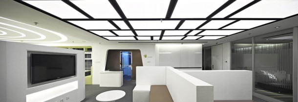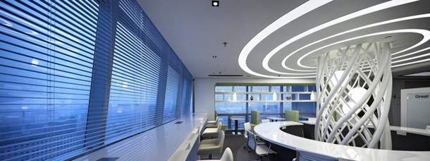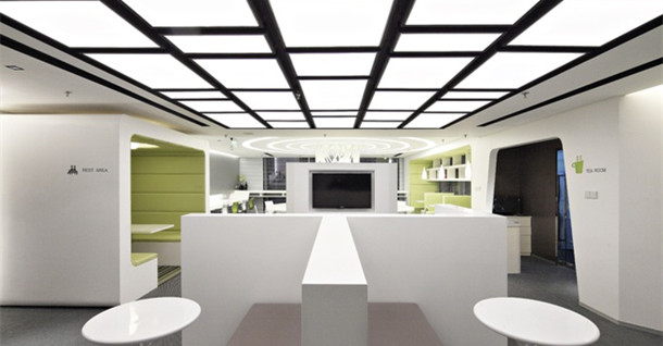 中心休閑辦公區(qū)采用光與型的結(jié)合營造出沖擊波般的視覺張力,象征著創(chuàng)業(yè)思想的無線延伸發(fā)展。