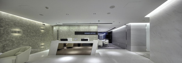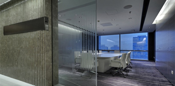 前廳的墻面設(shè)計采用云多拉灰進(jìn)口石材嵌入燈光的處理方式,雅士白石材分割出前廳的空間感,墻面嵌入的LED電視與LOGO墻滿足了客戶及時性展示不同的企業(yè)形象的需求。