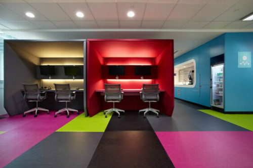 這里還有專為獨立思考的工作者特意設計的辦公空間呢。五光十色的顏色,是不是立刻讓你活躍的思維提起了興趣呢,明亮的色彩是可以提高工作的效率與工作激情的。