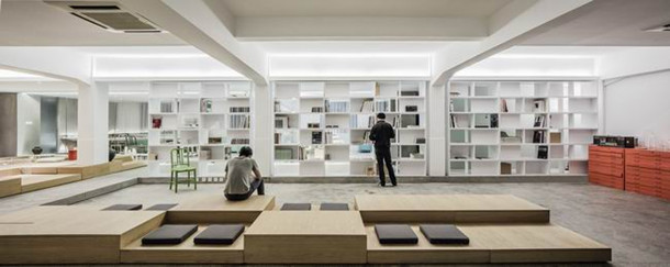 演講——兩種模數(shù)的白色木架由書架變?yōu)檠葜v所需的坐凳,而高15公分和30公分兩種規(guī)格橡木盒堆疊成為高45公分之講臺,滿足50-100人左右的小型演講報(bào)告會,也是所謂的設(shè)計(jì)師們切磋的平臺,也是設(shè)計(jì)師自我陶醉,滿足虛榮心的試驗(yàn)場。