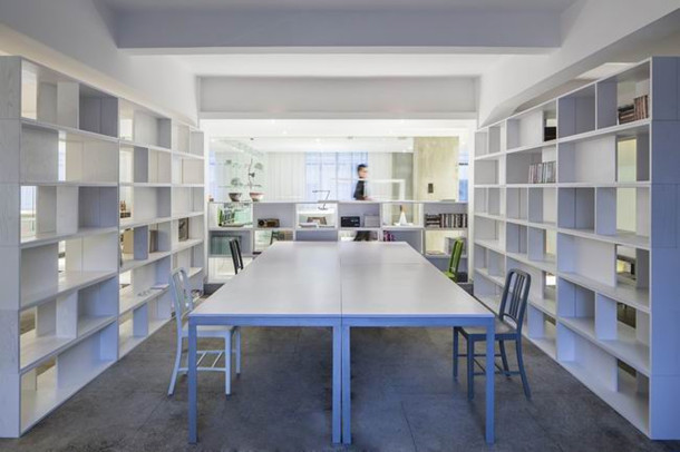 圖書館——所有的書架疊起,空間中變身成為一個(gè)小型圖書館,當(dāng)然這種功能在現(xiàn)在只有306平米的空間中還很奢侈,但是設(shè)計(jì)師可以創(chuàng)造空間,設(shè)計(jì)師置身于自己絞盡腦汁創(chuàng)造出稱之為圖書館的空間中,或許是過一把沒有機(jī)會做一個(gè)圖書館的設(shè)計(jì)之癮,而也或許是設(shè)計(jì)師在滿足自己虛榮心的又一個(gè)意淫行為而已。
