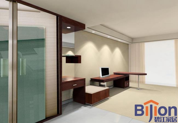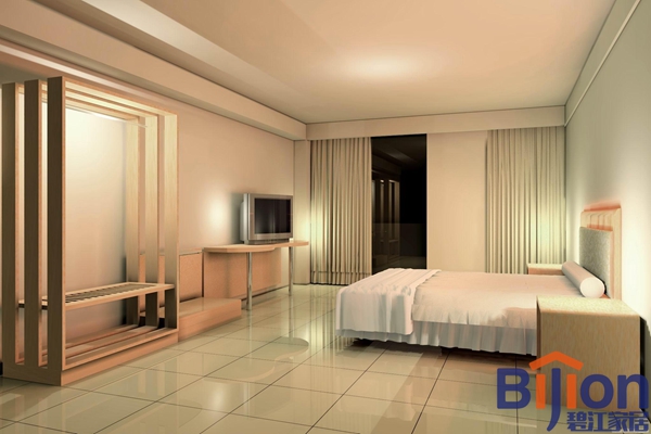 不同的酒店家具,表面用料是有區(qū)別的。如桌、椅、柜的腿子,要求用硬雜木,比較結(jié)實(shí),能承重,而內(nèi)部用料則可用其他材料;大衣柜腿的厚度要求達(dá)到62.5px,太厚就顯得笨拙,薄了容易彎曲變形;廚房、衛(wèi)生間的柜子不能用纖維板做,而應(yīng)該用三合板,因?yàn)榫S板遇水會(huì)膨脹、損壞;餐桌則應(yīng)耐水洗。