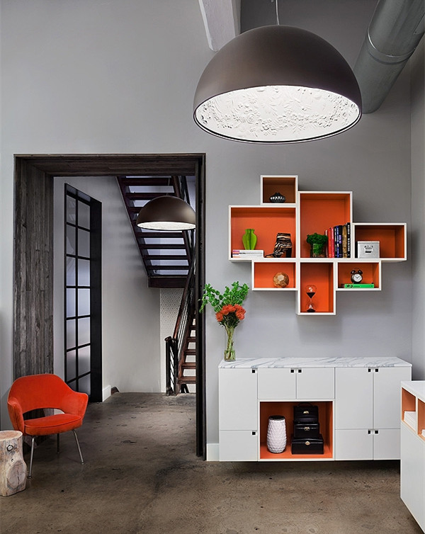 寬敞的會(huì)客室,整潔的過(guò)道,條理分明的貨架,這就像一個(gè)實(shí)體店鋪一樣漂亮。白色的墻壁上,橙色點(diǎn)綴般出現(xiàn)在里面的空間內(nèi)(比如拉開(kāi)的抽屜和貨架里的面板),這種少量的撞色感覺(jué)干凈又美觀。辦公室是開(kāi)放式的,有利于員工的交流。有圖有真相哦!