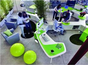 上圖是YAHOO在西雅圖的辦公室一角,整體采用較為明快的鵝黃綠作為主色調(diào),配合繁盛的綠植,休息沙發(fā)采用的藍(lán)色方正型,辦公面板的弧線和休息沙發(fā)的方正形成的視覺效果使得整體極富設(shè)計(jì)感。