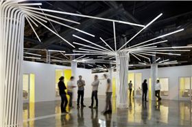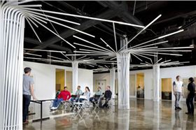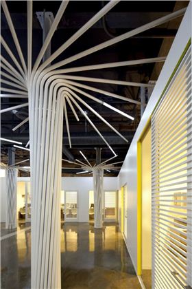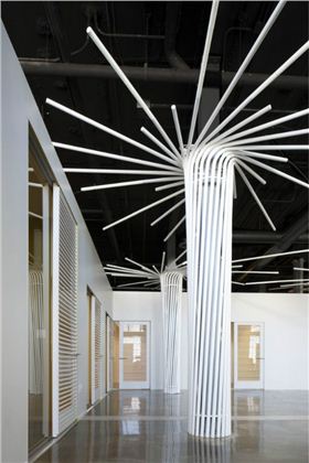 碧江上海辦公家具小編介紹介紹說,這是美國洛杉磯的貧民住房信托辦公室,里面用多根彎曲白色管狀來裝飾承重梁柱,使原本緊張壓抑的辦公室得到了放松,明亮了空間、緩解了辦公室的氣氛,人在輕松地環(huán)境里工作才能效益加倍,這樣的設(shè)計極有創(chuàng)意。